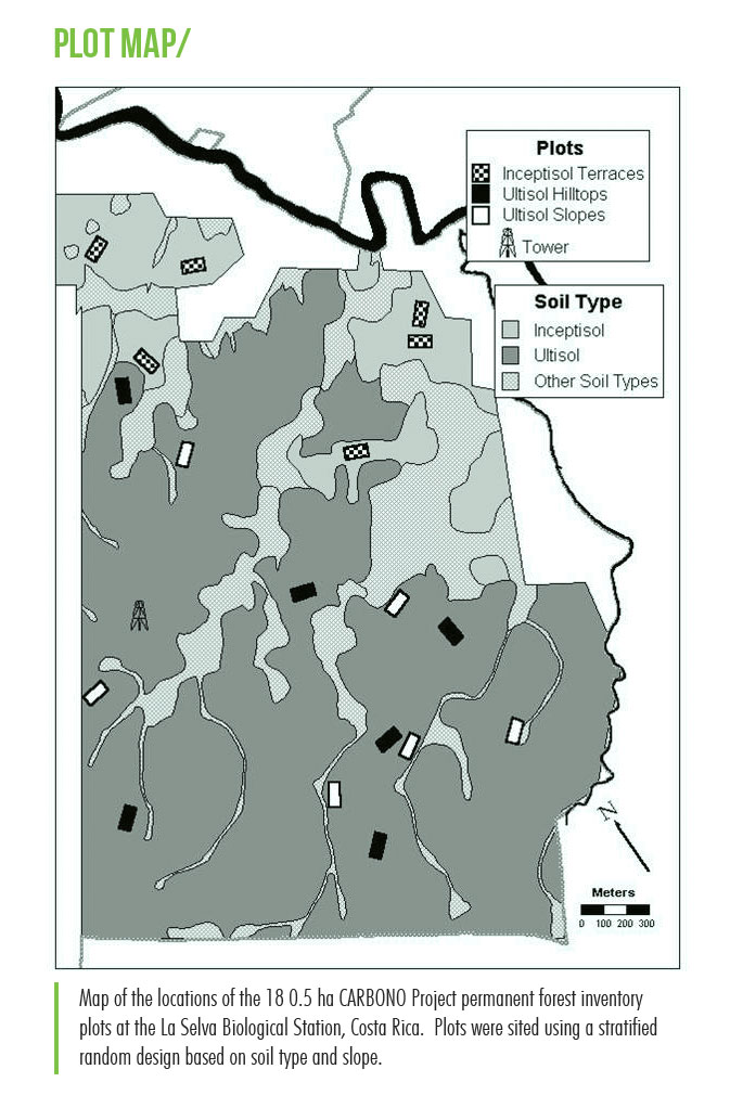 The CARBONO project is based on field measurements carried out across the project’s network of 18 half-hectare plots. The half-hectare plot size was selected based on both the spatial scale of significance within landscape variation in the forest basal area and the grain size of the different habitats of interest, particularly steep slopes. Three edaphic categories were identified as capturing the important axes of upland (non-swamp) landscape structure: (1) moderately fertile flat sites on old alluvium (the youngest oxisols at La Selva), (2) relatively infertile flat sites on ridge tops, and (3) relatively infertile steep slopes. Plot locations were selected using the La Selva geographic information system (GIS) to produce a stratified random design to sample the three edaphic categories. We used random numbers to select plot coordinates within the GIS coverages of soil types and slope. Potential plot locations that crossed streams, main trails, or protected areas were omitted. Plot selection was therefore stratified random within edaphic categories. An important feature of the plot-network design was that the researchers had no knowledge of forest structure at a selected plot location. As a result, the network provides a representative, objective assay of the entire landscape. Plots were surveyed with a tripod-mounted surveying compass and were based on slope-corrected distances (subsequently verified by GPS-location of the plot corners). In each plot, permanent monuments were installed at 10-m spacing.